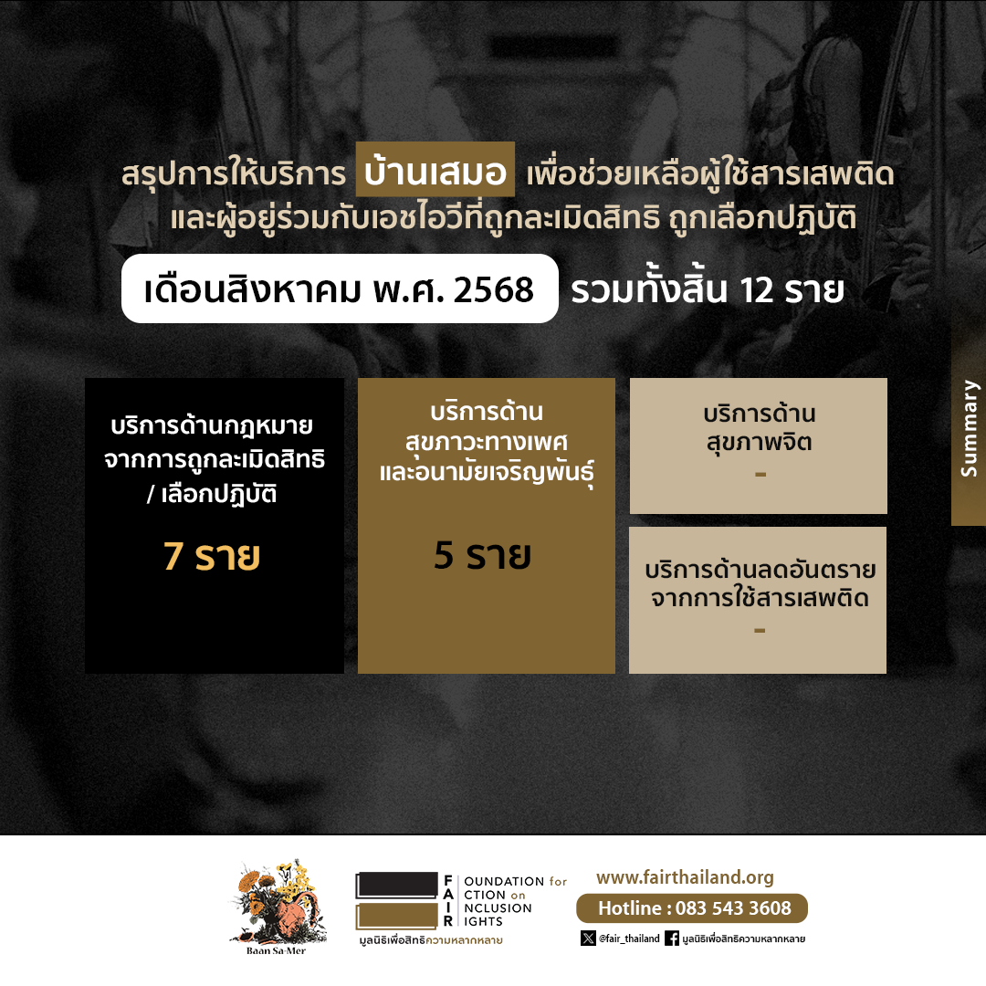 บางครั้ง “ความไม่รู้” อาจเป็นเหตุให้ผู้คนได้รับความเดือดร้อน แต่ไม่ถึงขั้นต้องห้ำหั่นหักล้างให้ฝ่ายหนึ่งฝ่ายใดเกิดหายนะต่อกัน หากมีพื้นที่ให้สร้างความเข้าใจและได้เรียนรู้ไปพร้อม ๆ กัน ตัวอย่างจากการดำเนินงานของ บ้านเสมอ โดยมูลนิธิเพื่อสิทธิความหลากหลาย (FAIR) ในการให้ความช่วยเหลือด้านสิทธิและกฎหมายตลอดเดือนสิงหาคม 68 พบว่า