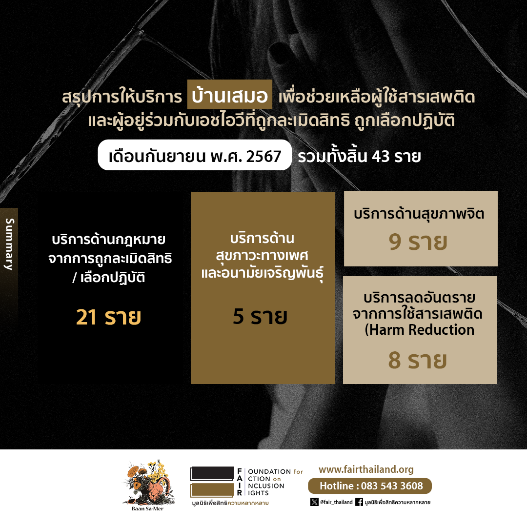 สำหรับบุคคลใดก็ตาม ที่ต้องเผชิญเหตุการณ์ถูกกีดกัน ละเมิดสิทธิ เลือกปฏิบัติด้วยความเป็นผู้มีเอชไอวี ผู้ใช้สารเสพติด หรือแรงงานข้ามชาติ สามารถติดต่อมาขอรับคำปรึกษา และรับการช่วยเหลือได้เสมอ สำหรับรายละเอียดการให้บริการของ “บ้านเสมอ” โดย มูลนิธิเพื่อสิทธิความหลากหลาย ในรอบเดือนที่ผ่านมา ได้ดำเนินงานให้ความช่วยเหลือทั้งสิ้น 12 กรณี ซึ่งมีผู้ได้รับผลกระทบ 43 ราย ตามรายละเอียด ดังนี้