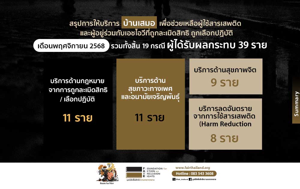 และนี่คือสรุปผลบริการของ “บ้านเสมอ” ซึ่งให้ความช่วยเหลือทางกฎหมายและให้คำปรึกษา ตลอดเดือนพฤศจิกายน 68 รวมทั้งสิ้น 19 กรณี มีผู้ได้รับผลกระทบ 39 ราย ตามรายละเอียด ดังนี้